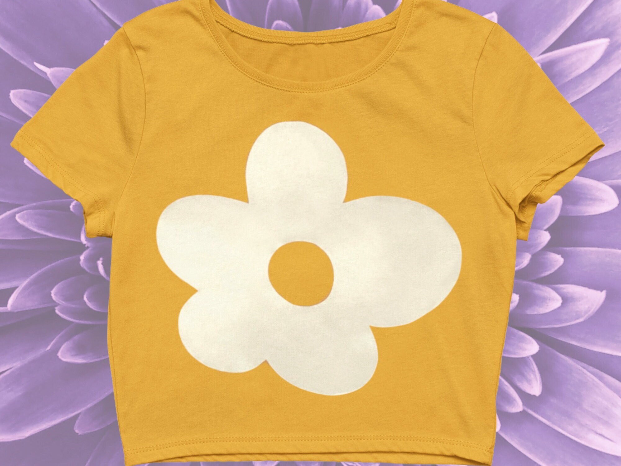Y2K fashion trends are back! That means tops with bold designs like this yellow one with a metallic silver flower design.