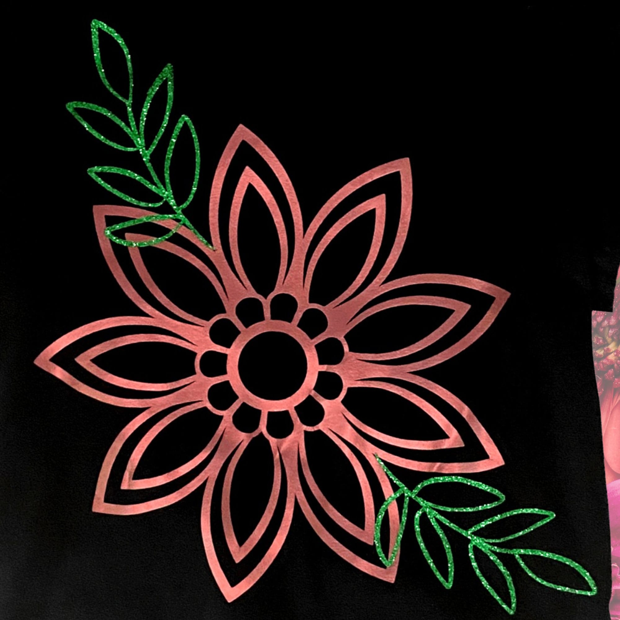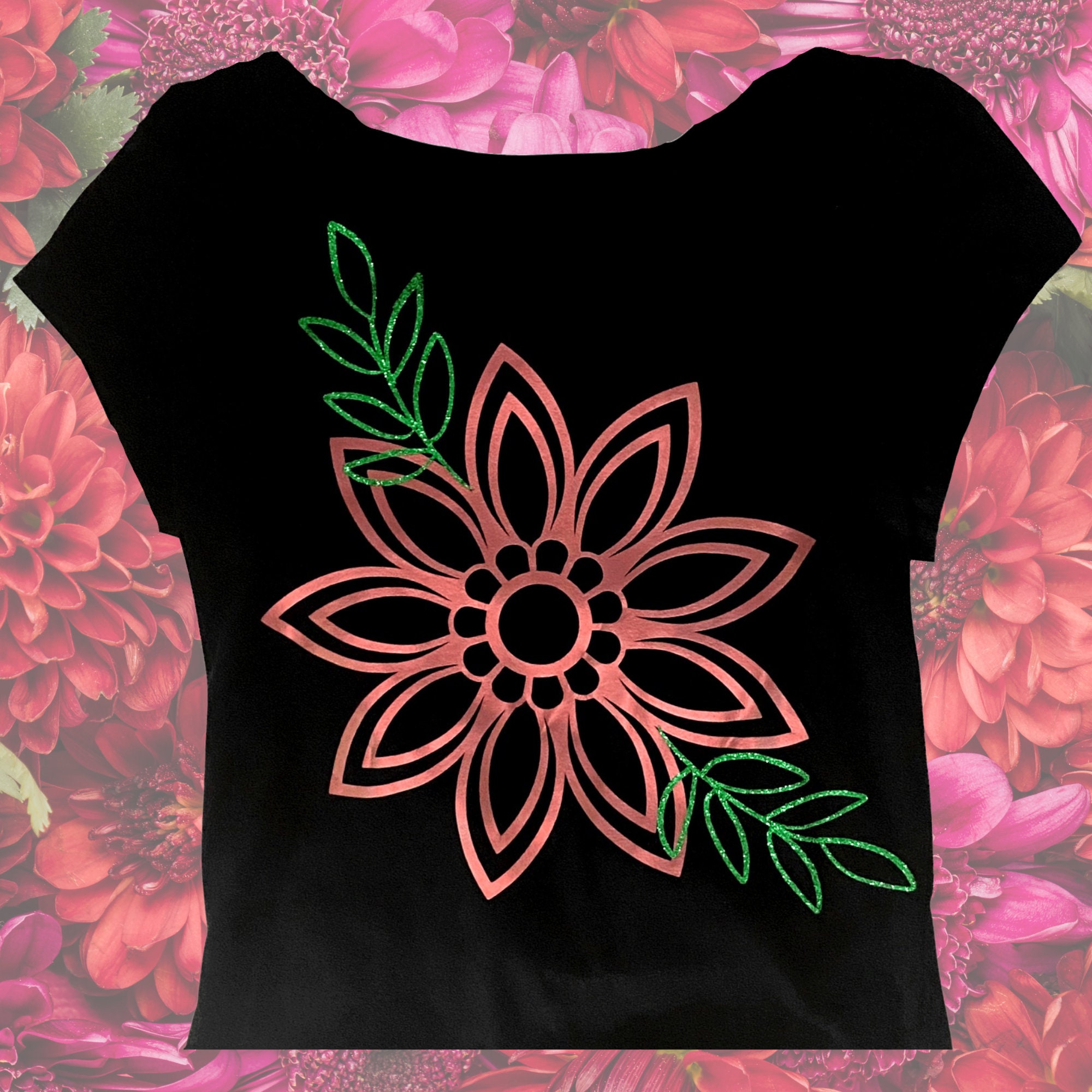 90's fashion trends are back! That means crop tops with bold designs like this black cotton top with a metallic pink flower and glitter green leaves design ironed on. Available in either a cut-off cropped style or waist-length!
