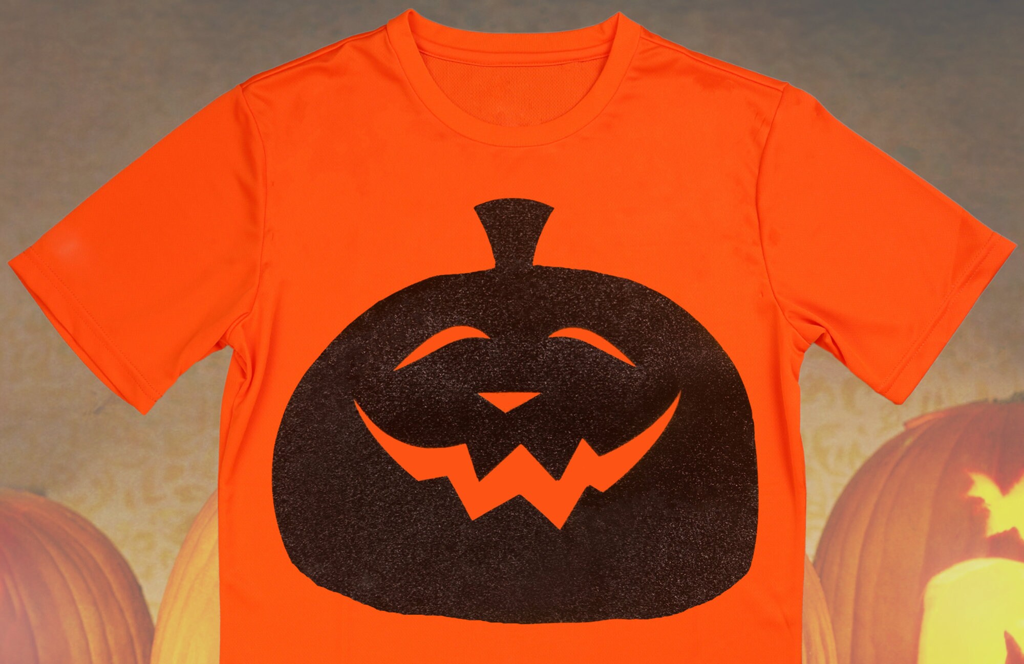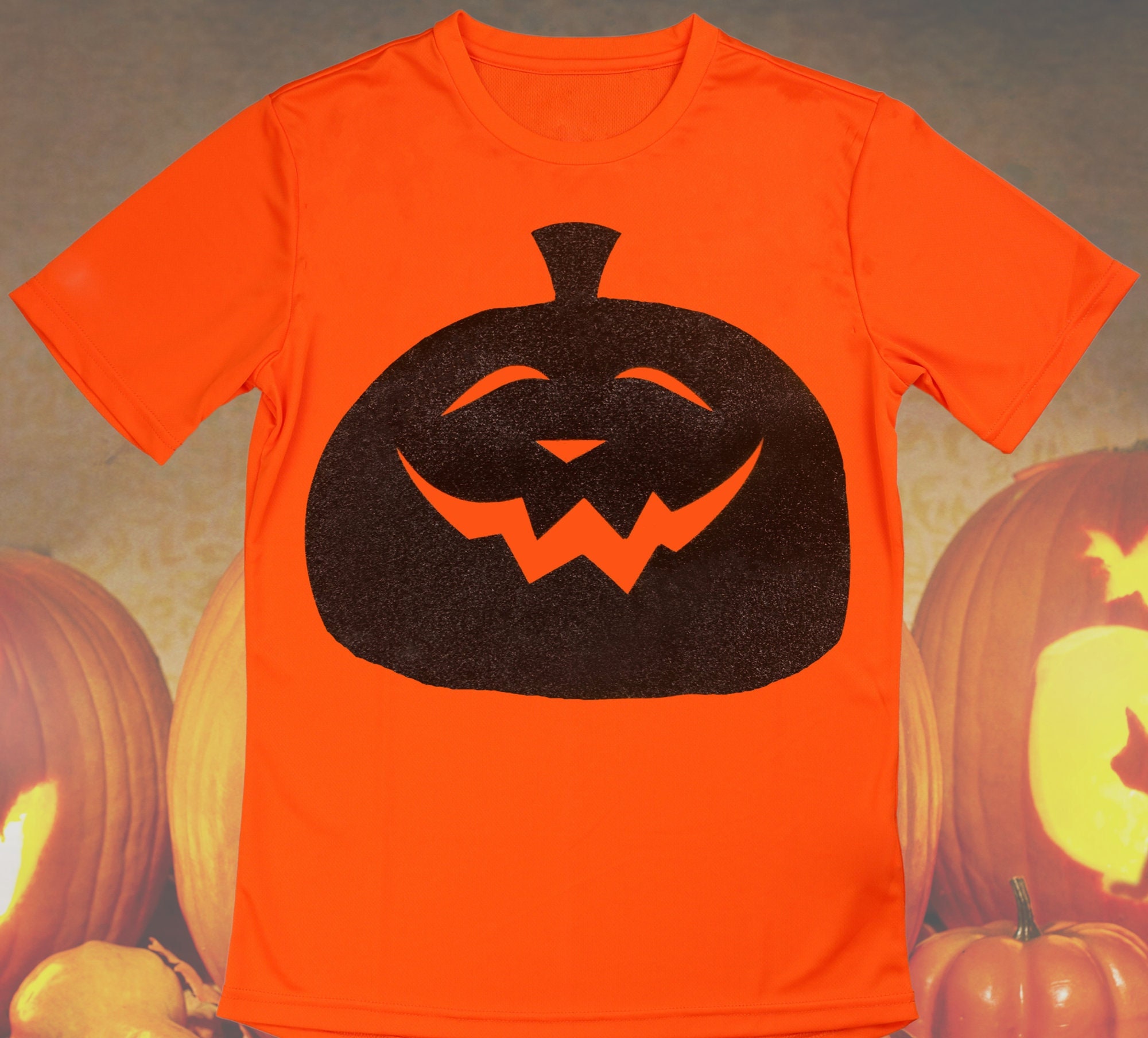 Halloween's not just for the spooky, but also the silly! Like with this glitter black grinning pumpkin graphic on an orange cotton t-shirt with the option to leave it long or have it cropped at the waist.